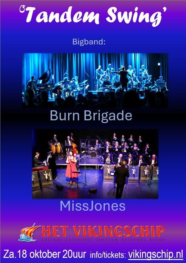 Zie vooral ook onze concertagenda voor details en meer optredens, maar ons eerste volgende openbare concert is : Bigband Miss Jones & The Burn Brigade in het Vikingschip Den Oever; “Tandem Swing” !