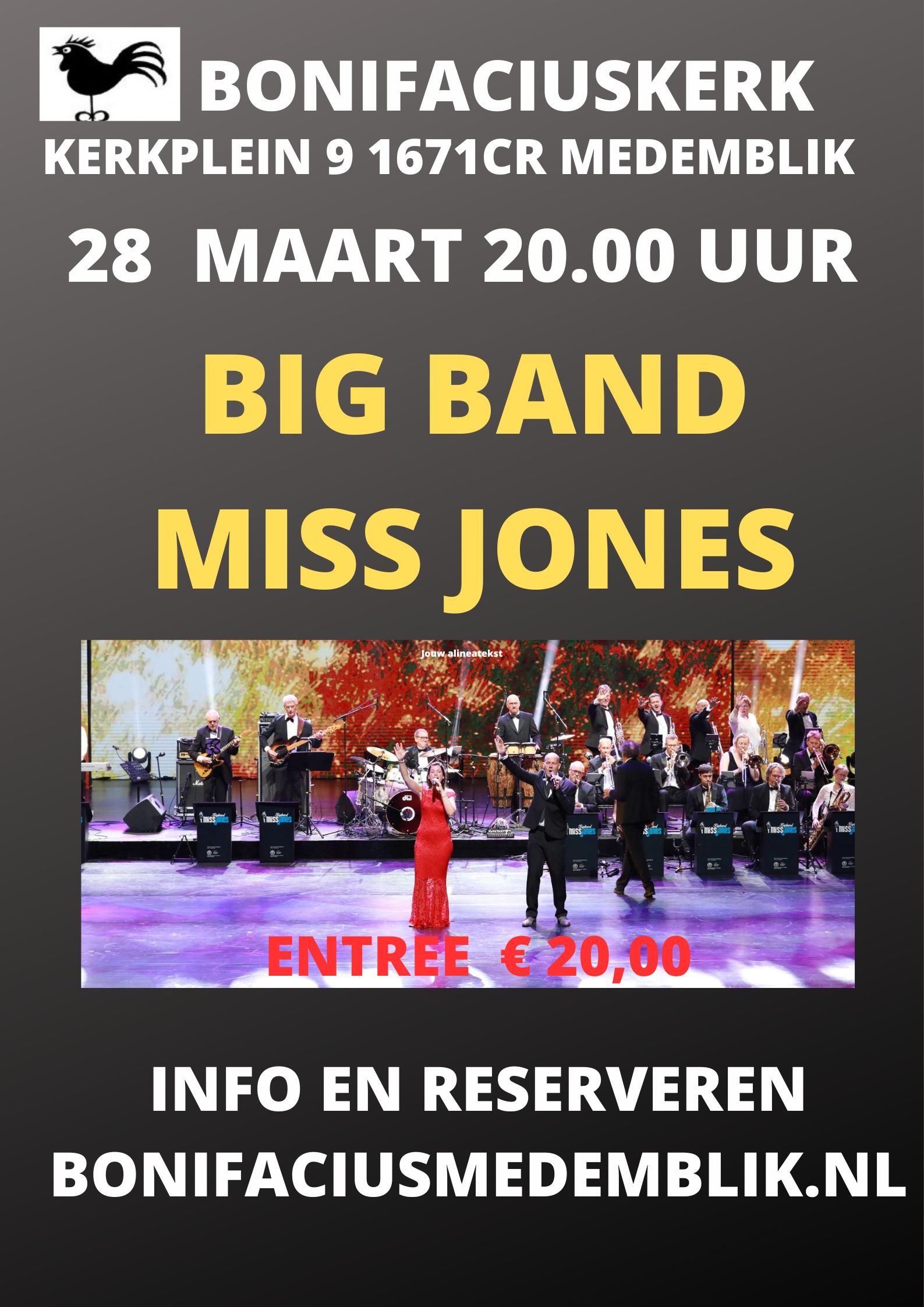 Zie vooral ook onze concertagenda voor details, reserveringsinformatie en meer optredens; ons eerste volgende openbare concert is : Theaterconcert in de Bonifaciuskerk in Medemblik op 28 maart 2026. Laat je meevoeren door een avond vol muziek en sfeer in de prachtige Bonifaciuskerk in Medemblik. Geniet van de beste swing-, pop- en soulnummers โ van heerlijke easy listening tot onweerstaanbare uptempo hits waarbij stilzitten geen optie is. Een concert dat raakt, verrast en swingt zoals alleen MissJones dat kan brengen.